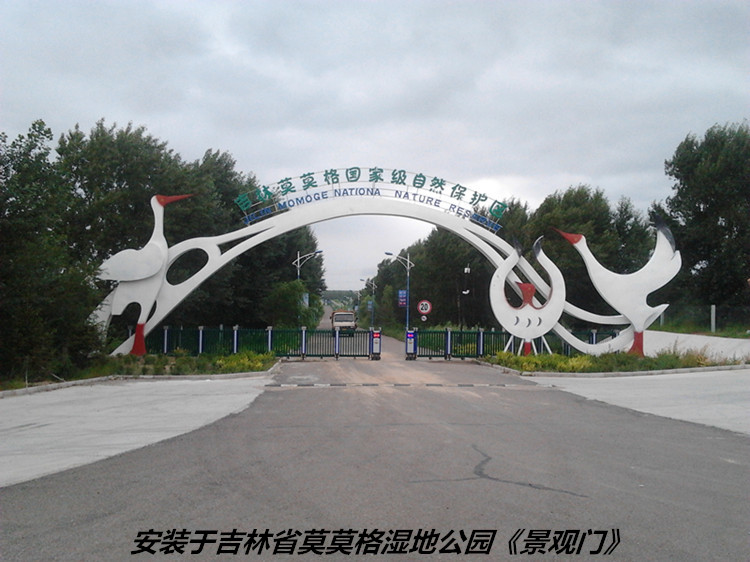 安裝于吉林省白城市莫莫格濕地公園《景觀大門》 材質為:內鋼材骨架,外為不銹鋼板,表面噴涂氟碳漆。